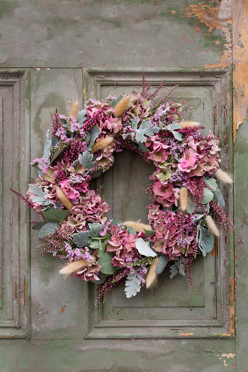 Maffig höstkrans med hortensia, ljung och eukalyptus som passar lika bra till en bordsdukning som till att hänga på dörren.