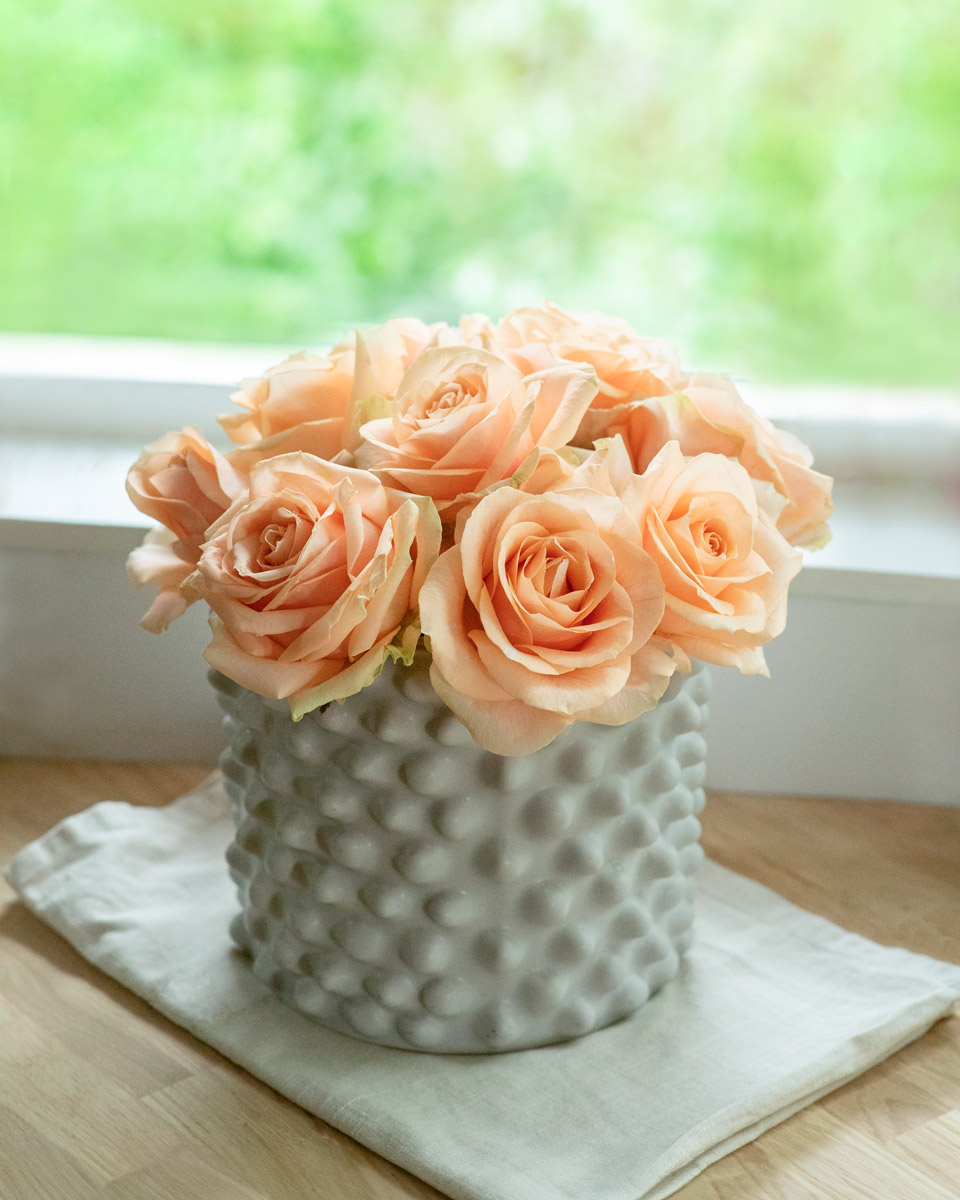 Nu har din bukett vuxit till sig! Tryck inte ihop den i en för liten vas, låt istället stjälkarna få utrymme att spreta inuti vasen så att du maximerar känslan. Det är också fint att hålla ihop formen så att buketten får ett bulligt och runt uttryck. Då kan du behöva korta ner stjälkarna innan du sätter ner dem i en passande vas.