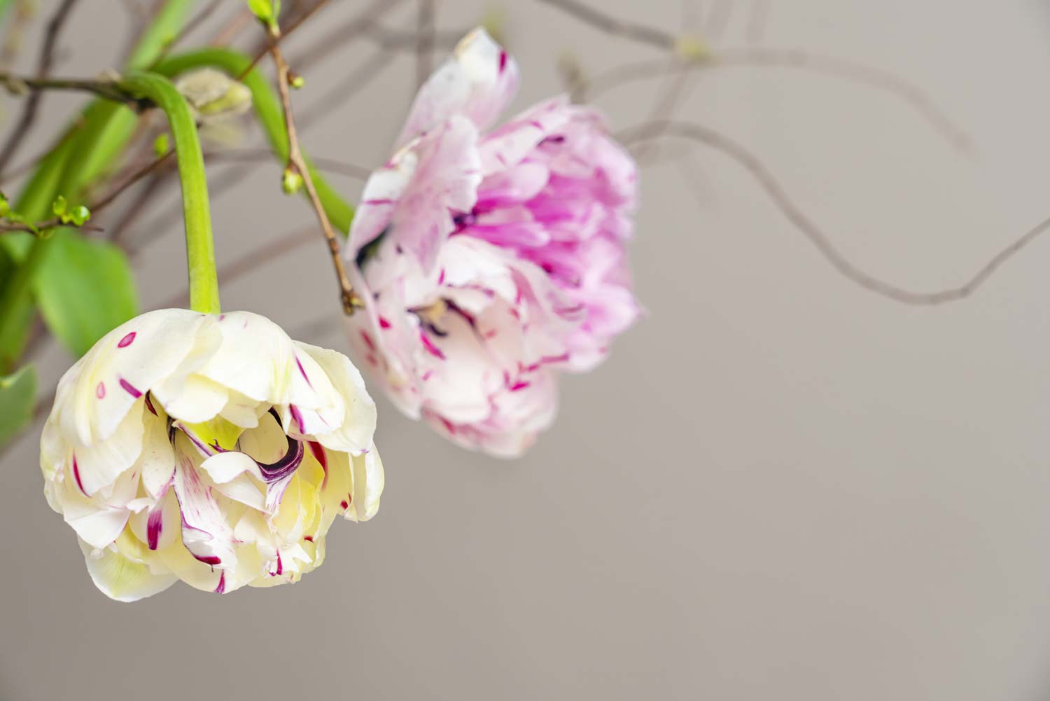 I buketten Vårljus sträcker sig just långstjälkade franska tulpaner uppåt och utåt sidorna tillsammans med blommande kvistar och spektakulära ranunkeln ’Clooney’.