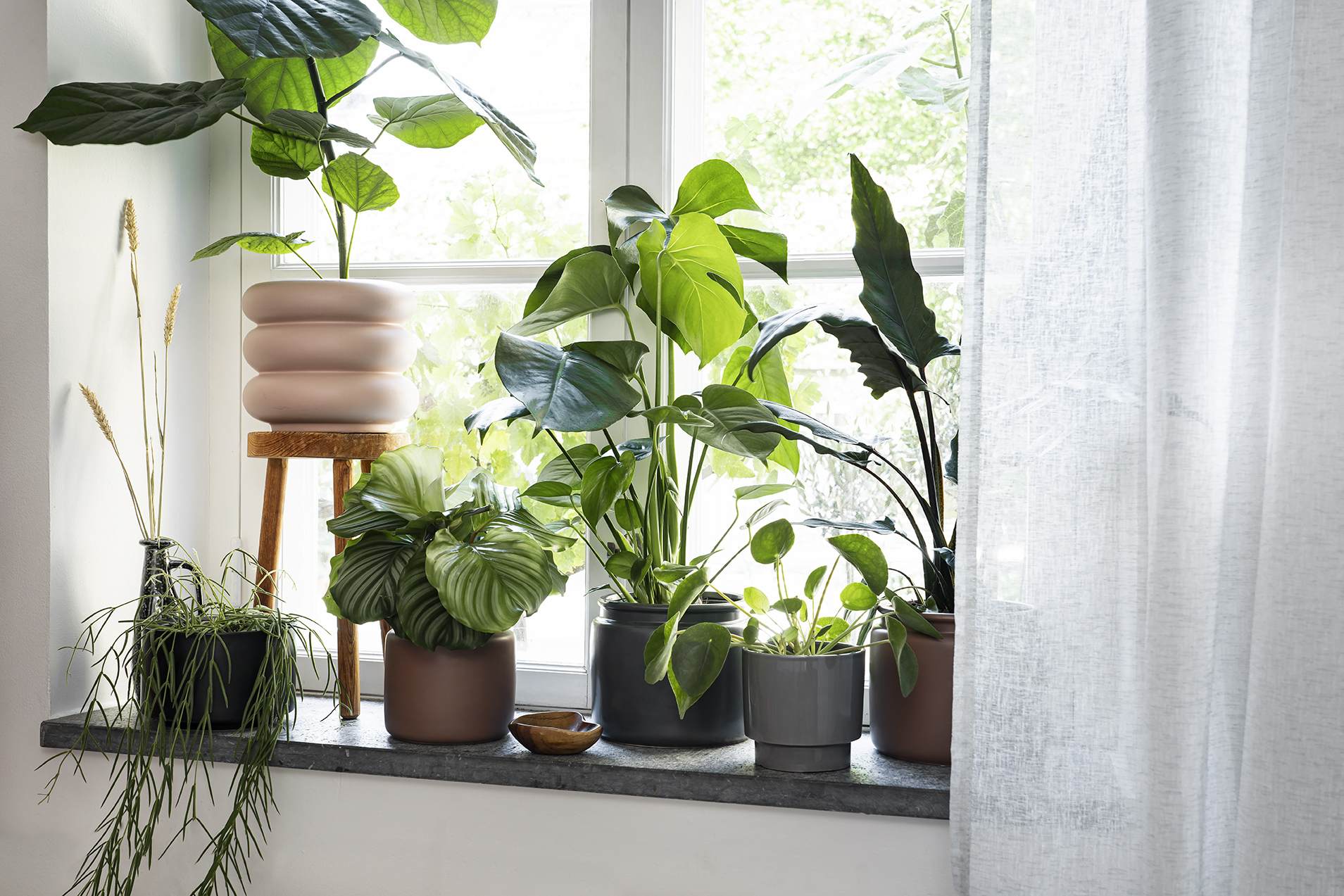 I det lite solfattigare norrfönstret finns också stora möjligheter. Här trivs den draperiliknande porslinsblomman, ståtliga fikusen ’Umbellata’, rundkalatean med sina randiga blad, monstera, elefantöra och papuasköld. Arrangera dem i olika höjd och håll ihop krukornas kulörer. Då kommer bladens form och mönster till sin rätt. Dina gröna växter är inte bara vackra, de renar luften och gör att rummen känns varma, mysiga och ombonade. Skäm bort dem ibland! Under tillväxtsäsong behöver de flesta näring och vintertid mår många bra av en dusch med blomsprutan. Du hittar allt för din gröna stil på Interflora Home.